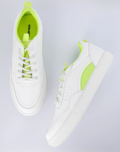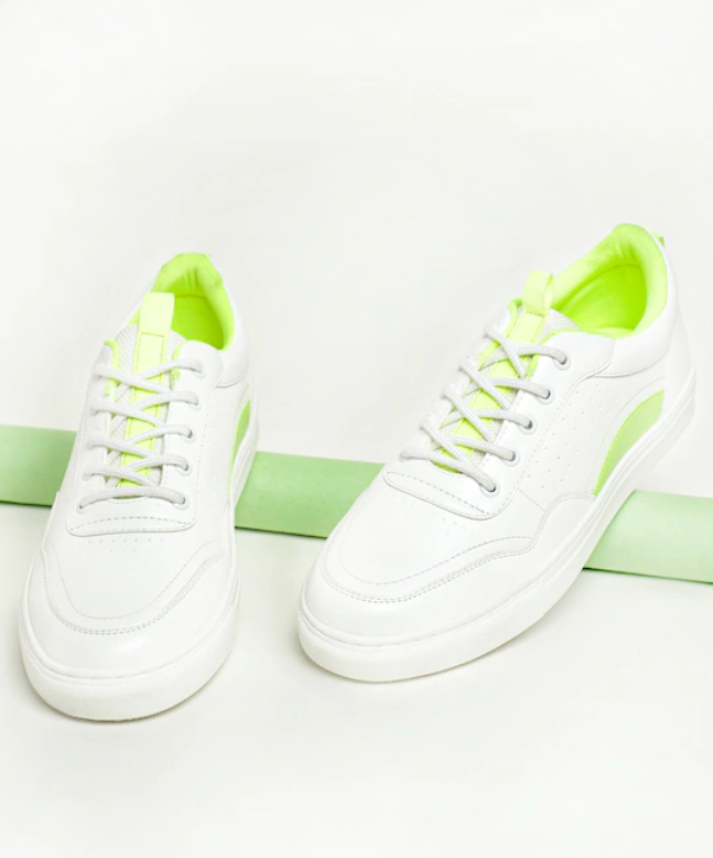 A pair of round-toe white & green sneakers, has regular styling, lace-up detail